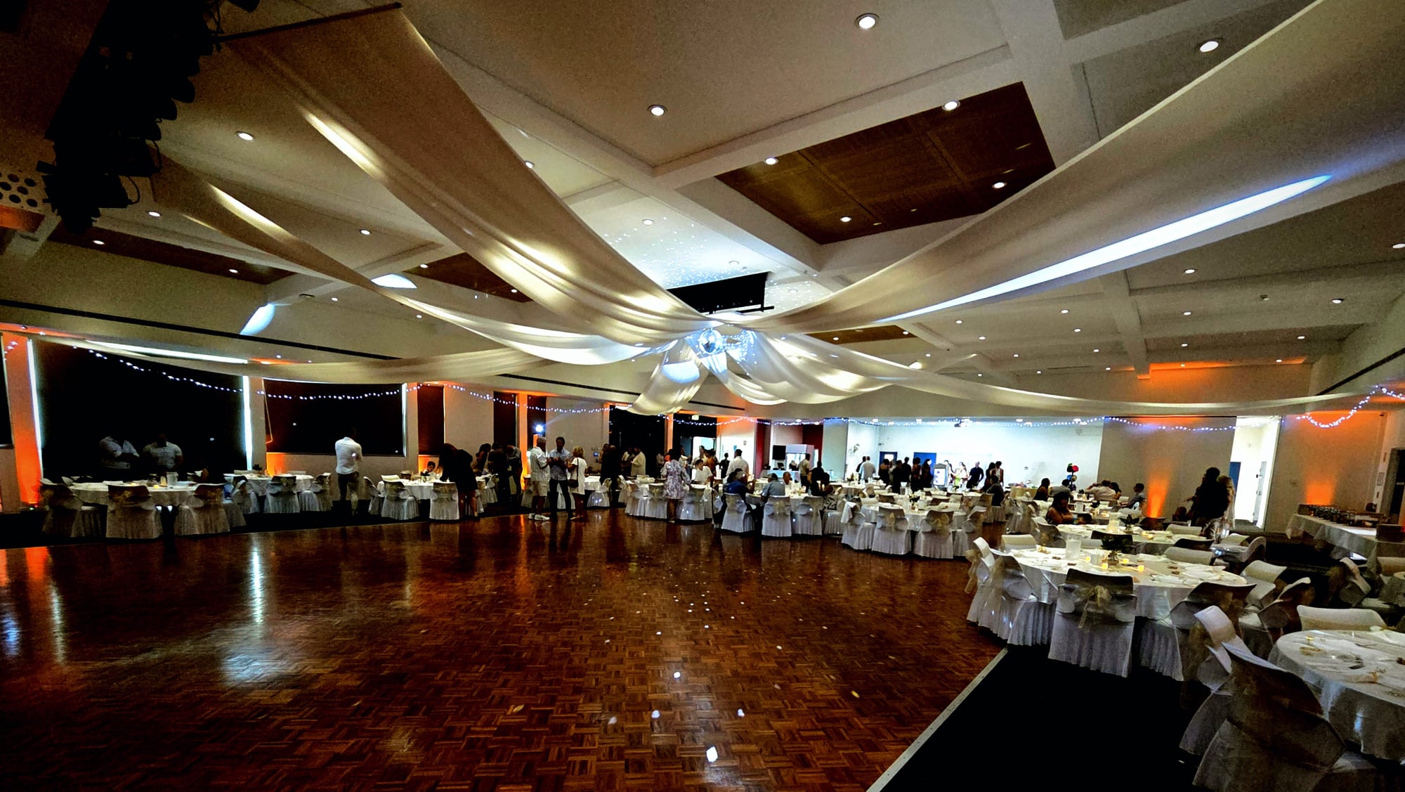 Black and gold theme is for tonight so uplighting will be in gold. Tonight is white Podium DJ booth, uplighting and gobo lights. A celebration of Indian and western culture of music. Our clients have opted not to have videos or photos of tonight taken, which is their prerogative and we respect that choice.
